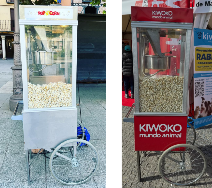 Los carritos de palomitas se pueden alquilar desde 1 hora. Vienen con el camarero incluído. Las palomitas se sirven en cajitas de cartón como las de los cines. Hay varios tamaños 45g, 90g y 225g.
